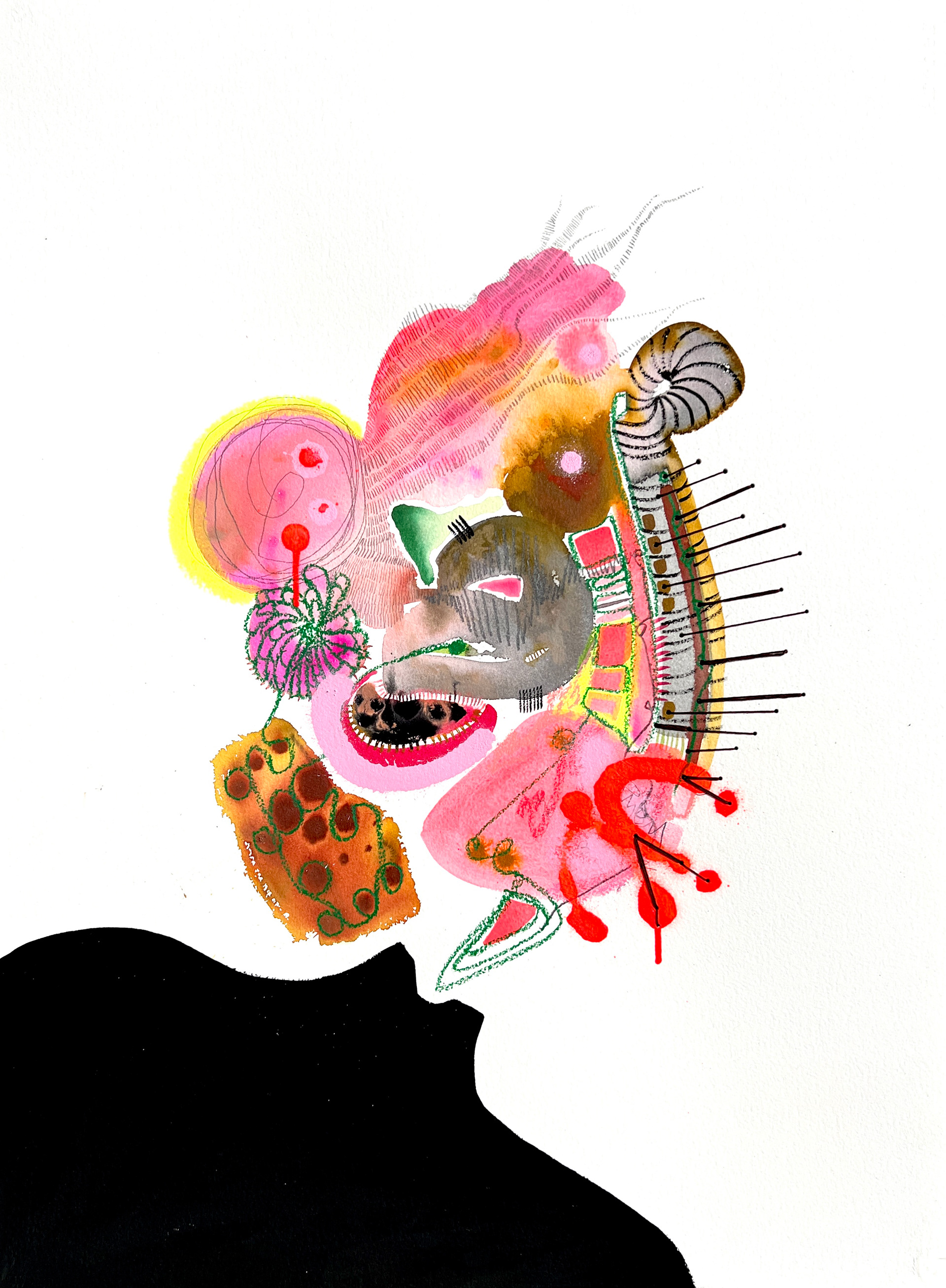 Watercolor, ink and graphite on watercolor paper.