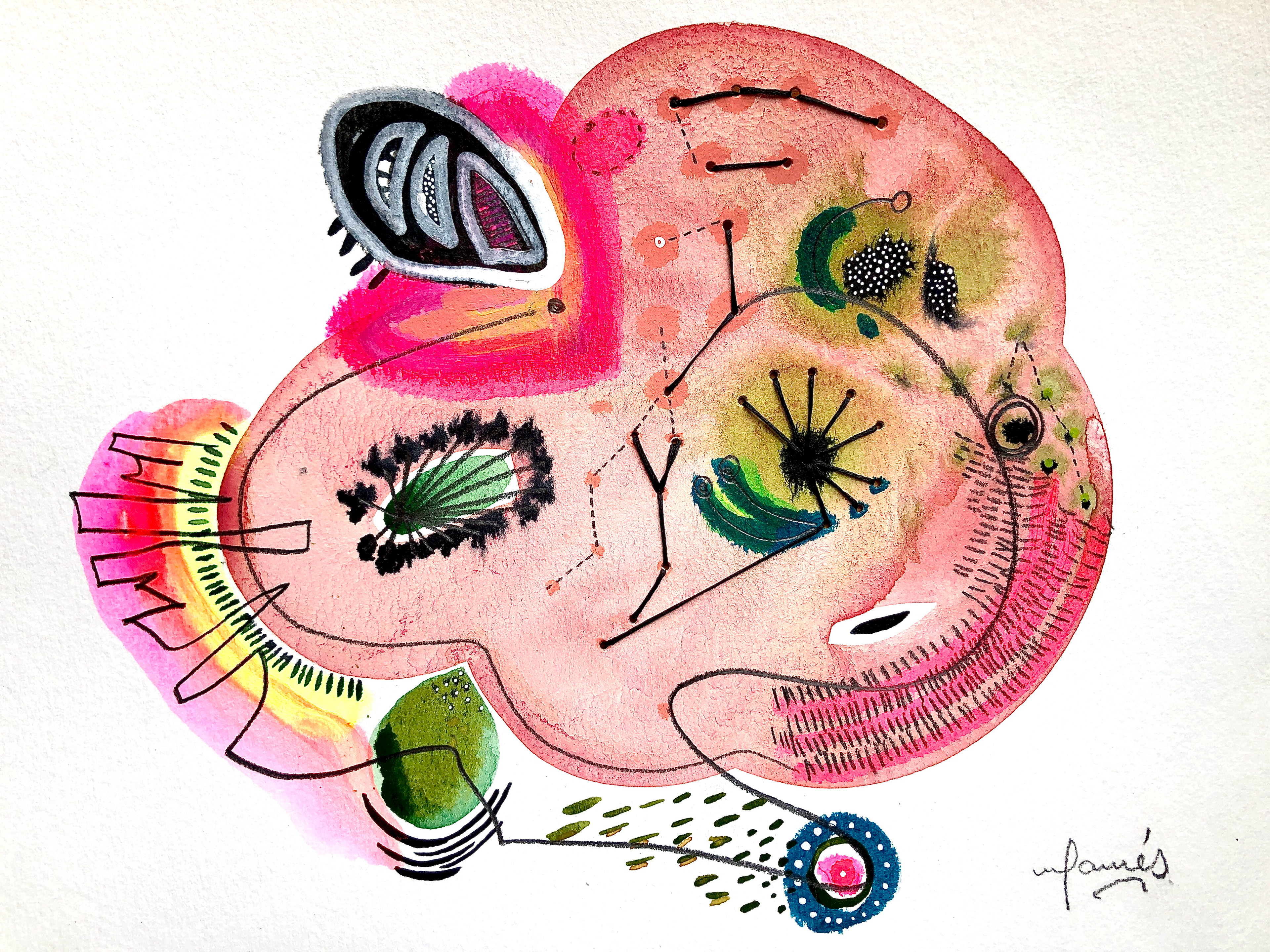 Watercolor, graphite, ink, fibers and paint sticks on paper.